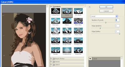 Step 3: Now apply the Cutout filter (Filter => Artistic => Cutout). On the left side the amount of detail in the vector can be controlled by adjusting the Number of Levels, Edge Simplicity and Edge Fidelity sliders. For this example I am using 5 levels, with the Edge Simplicity set to 3 and Edge Fidelity set to 3. Click OK.