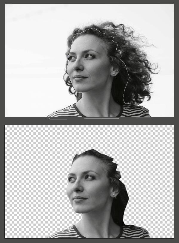 Now we need to make a selection of the hair. I used the path that I saved from Step 1. Then I modified it a little to line up with the hairline’s shape and softness. I did this by using Quick Mask Mode(Q), and using brushes of various sizes and softness to match the hairline.