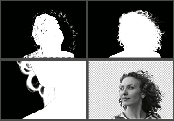 Hit Command+I to invert the red copy channel. Re-enable the mask on the “girl” group. Load the selection of the red copy channel with your background color set to white. Hit Delete(backspace) to fill the selection with white on the “girl” mask. If you hit Alt+Click on the mask thumbnail, you can see the mask as a channel. Clean up anything that looks as though it shouldn’t be there, like that line between the hair and the face.