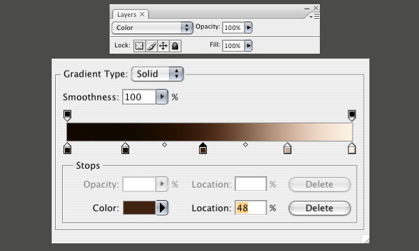 A Gradient Map uses the grayscale data from the image below it to apply the gradient that you create. The left side of the gradient represents the darkest parts of the image. The right side represents the light parts. We need to make a gradient that represents what the woman’s skin tone might look like from dark to light. I used the gradient below.