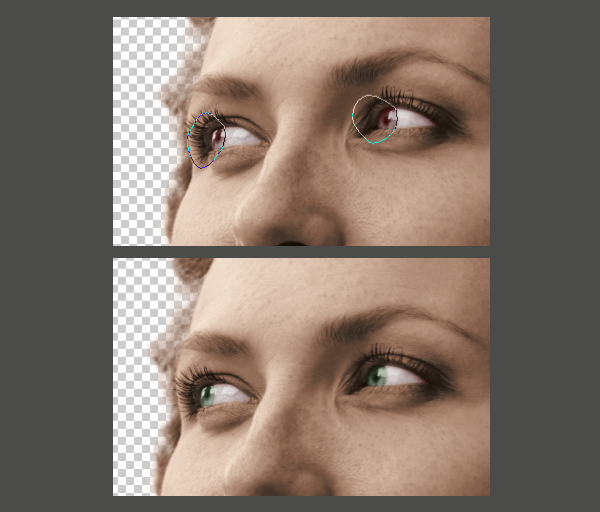 Draw a path around just the iris of the eye. Note that we need only the path to follow that one curve between the iris and the whites because the adjustment we are making will be applied as a clipping mask. Load the selection and Feather it 2px. Make a solid color adjustment layer just above the Gradient Map from the previous step. Then set it to a dark faded green. Hit Alt+Command+G to apply it to the same clipping mask you made earlier. Set the blending mode of the green layer to color. You might have to go back and adjust the green until you get a color that looks real.