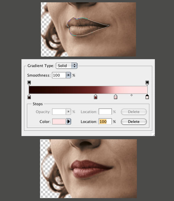 Repeat all the previous steps for the lips, except for this one we’ll leave the blending mode of the Gradient Map to Normal, and set the layer’s Opacity to 65%.
