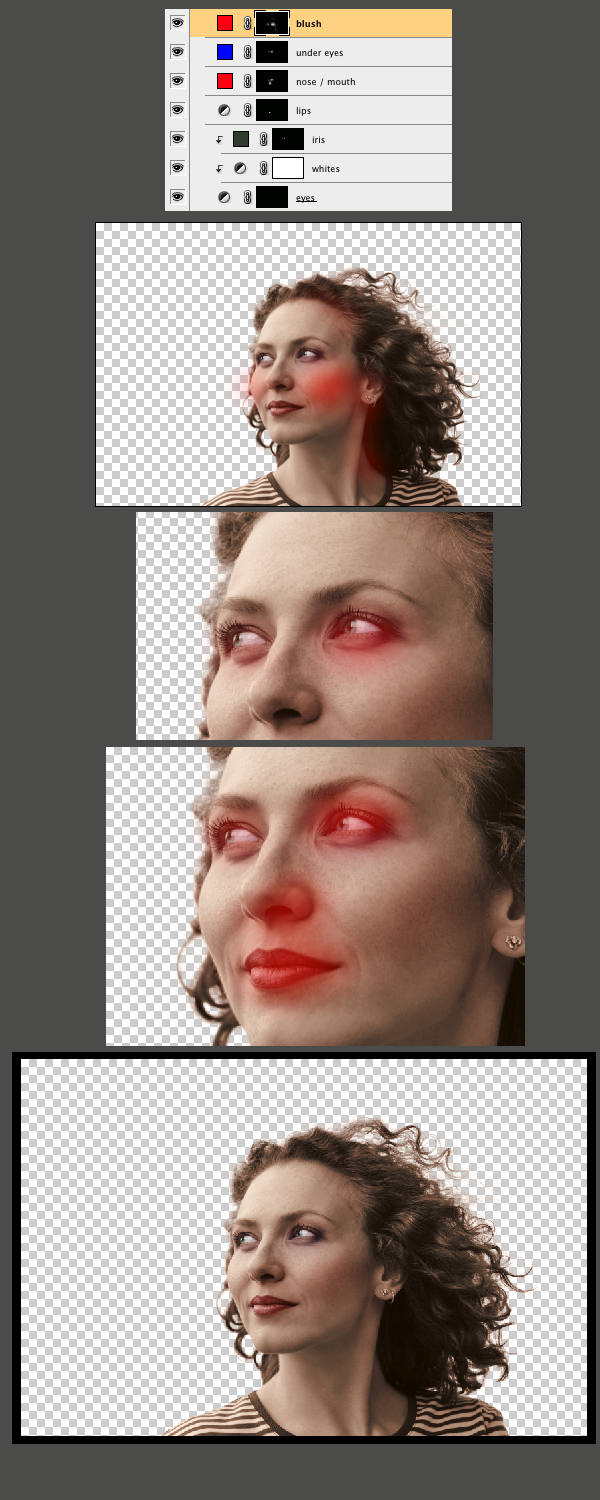 We need to get more variance of color in the skin tones to make it look more real. I made some selections around the eyes, nose, and cheeks. Then I feathered them 20–40px, created solid color adjustment layers, set the blending modes to Color, and brought the Opacity way down to 10-20%. Below you can see my selections as quick masks. The layer palette shows the colors I used for the different areas. As you can see I used some red to add some blush to the cheeks, some red around the nose, mouth and eyes, and some blue to go on the bags of her eyes. These small details make all the difference.