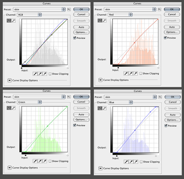 Make a loose selection around the face and neck and feather it 50px. Make a curves adjustment layer just above the ‘skin’ Gradient Map that we made earlier. I just went in and tweaked the colors a bit to get a little more color variation in the skin tone. You can download the curve file I used here.