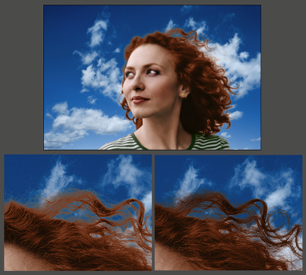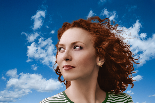 Choose a Sky image. I used one I shot myself, but there are plenty of stock images you could use. Bring it into the document below the “girl” group. Hit Command+T, and size it to fill the frame. It looks good, but notice that our hair mask still isn’t really looking that good against the blue background. The hair turns a muddy gray in the transition between hair and sky. To fix this, make a new blank layer just above Layer 0 (the image of the girl). With a large and soft black brush paint over those areas with an Opacity of 15-25% until the transition looks better.