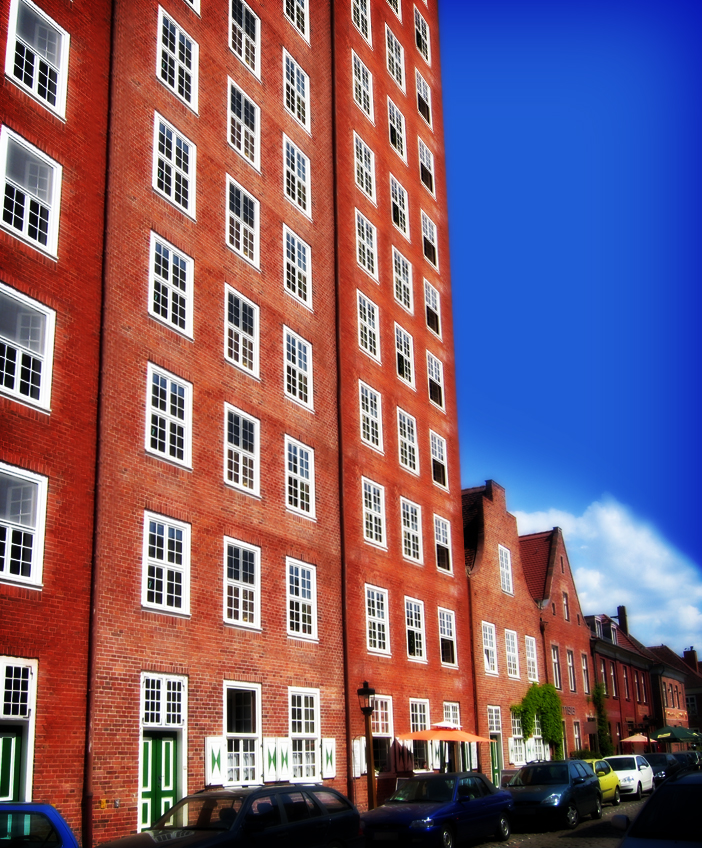 Add a layer mask to the picture layer and paint with a huge brush on it. Delete the sky over the buildings. Finally, merge the sky blue background with the original picture and name the resulting layer "Buildings."