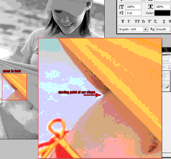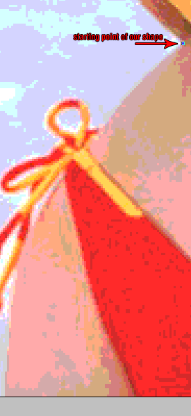 Now press F to go into fullscreen mode, this will make tracing shapes easier. Zoom in at around 300% using the zoom tool, then hold down the space bar (your cursor will change to a hand) click and drag the image so that you are looking at the part of the picture same as below.