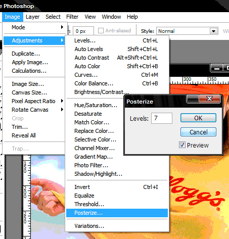 Duplicate the current layer by pressing CTRL+J then go to Image>Adjustment>Posterize. Type 7 in the levels input box.
